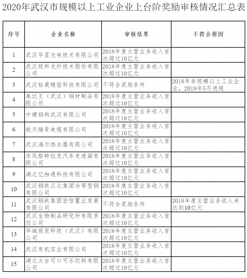 附表:《2020年武漢市規(guī)模以上工業(yè)企業(yè)上臺(tái)階獎(jiǎng)勵(lì)審核情況匯總表》