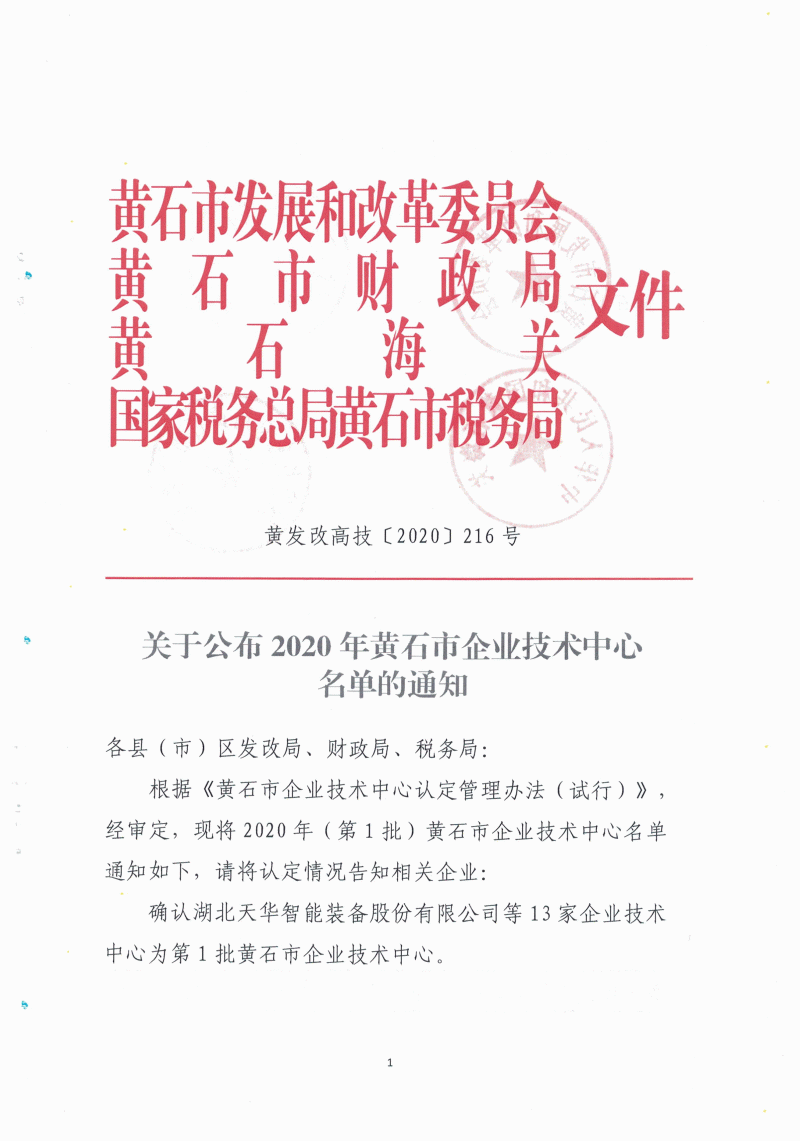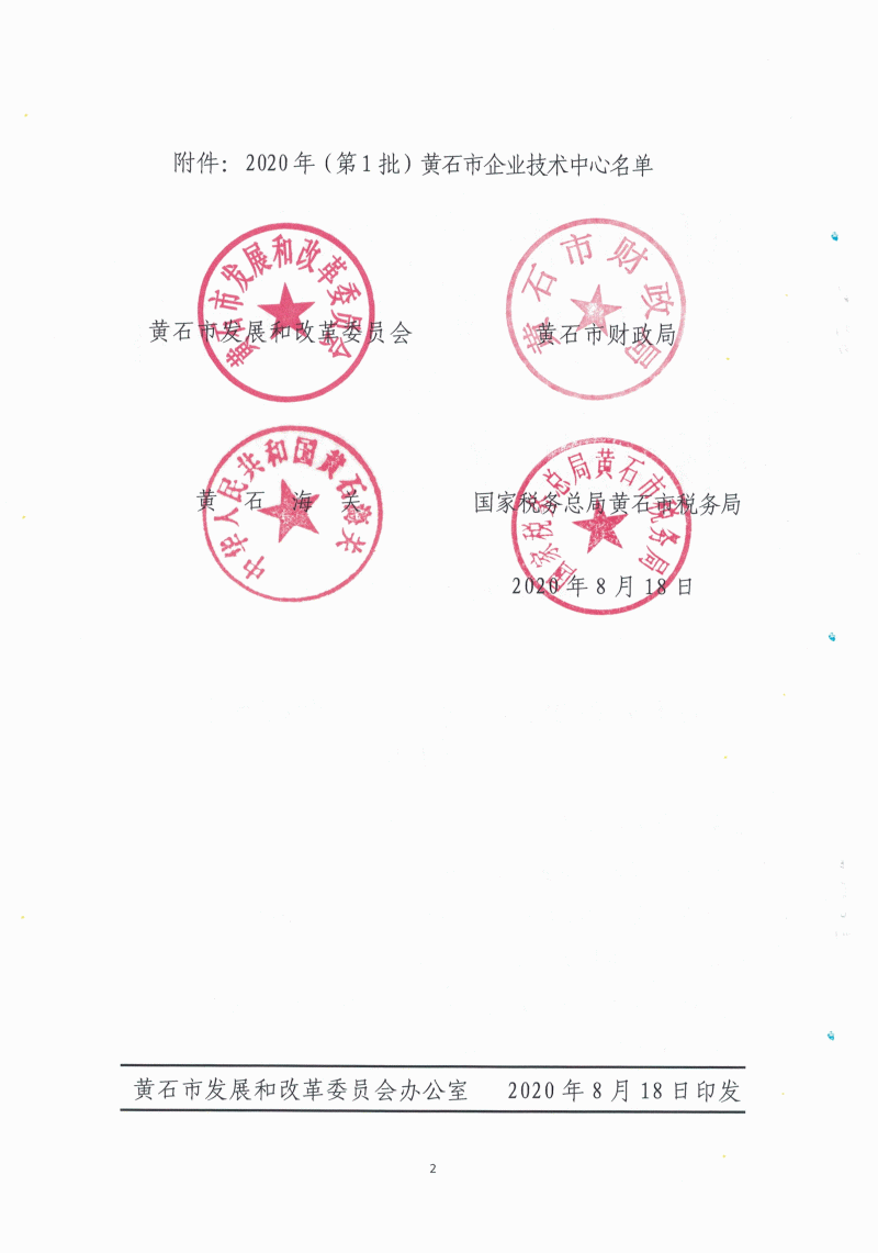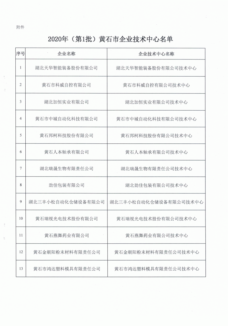 2020年(第1批)黃石市企業(yè)技術中心名單公布